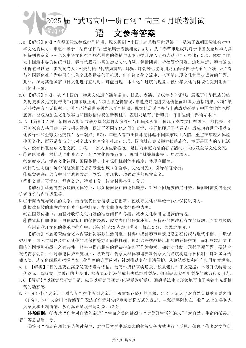 广西壮族自治区“武鸣高中-贵百河”2025届高三下学期4月联考 语文答案.pdf