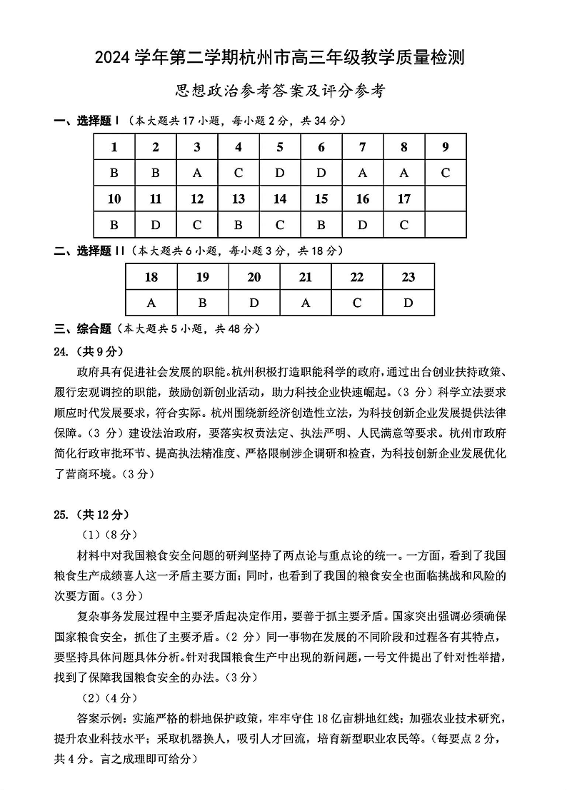 浙江省2024学年第二学期杭州市高三年级教学质量检测 政治答案.pdf