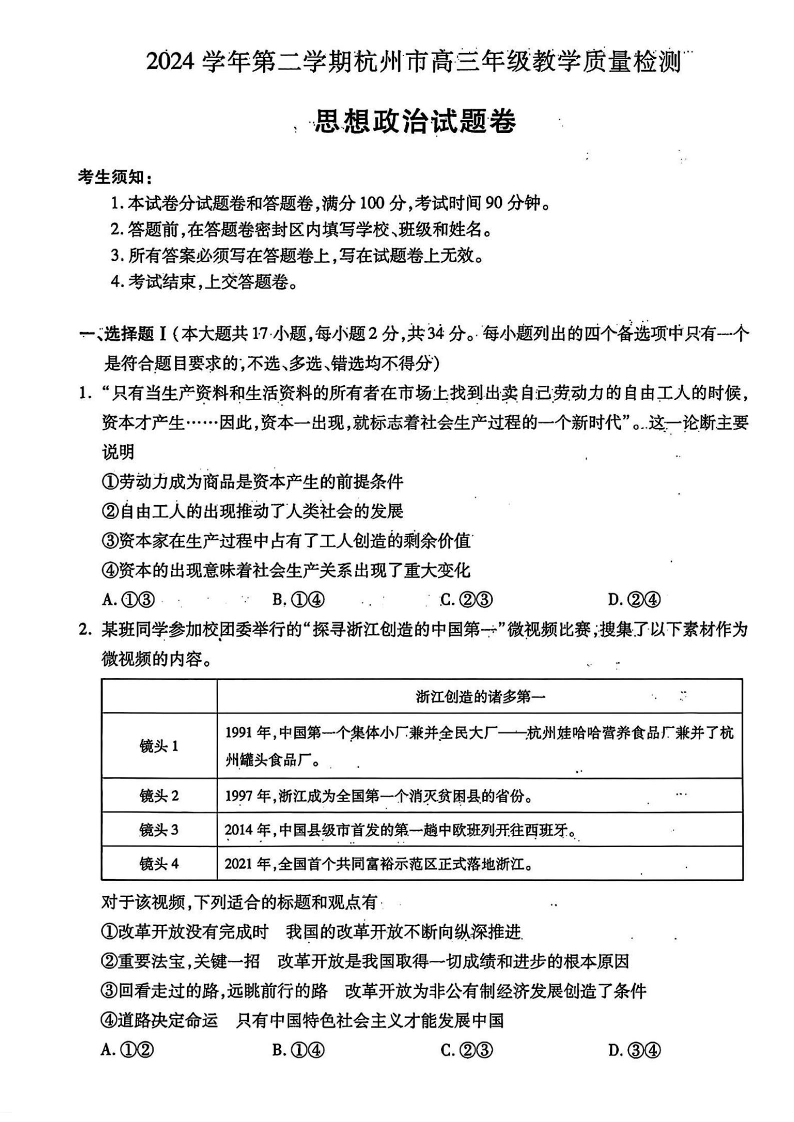 浙江省2024学年第二学期杭州市高三年级教学质量检测 政治.pdf