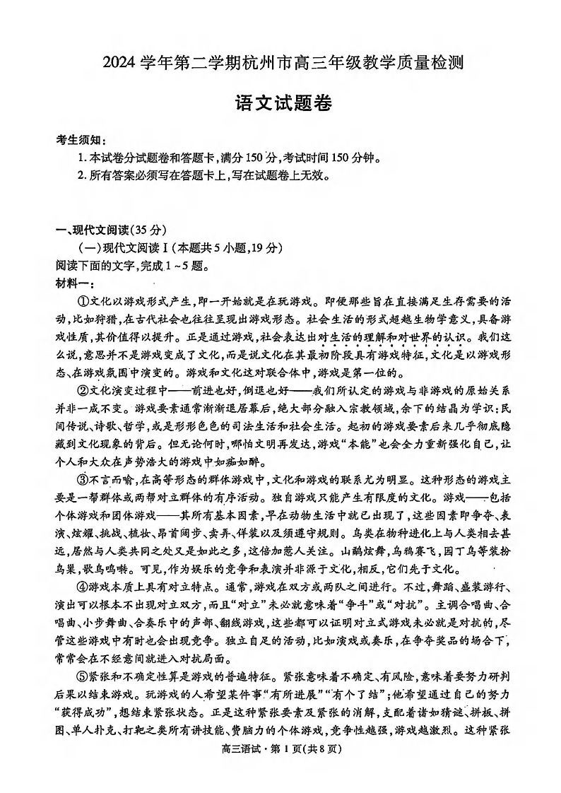 浙江省2024学年第二学期杭州市高三年级教学质量检测 语文.pdf
