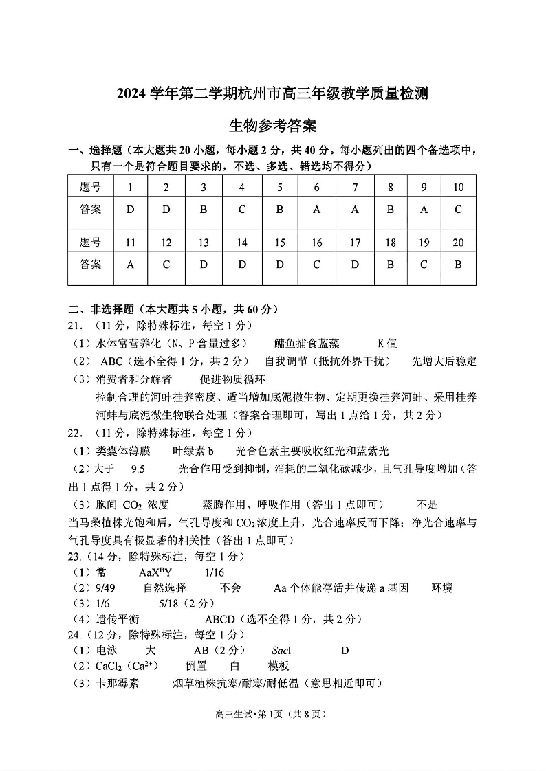 浙江省2024学年第二学期杭州市高三年级教学质量检测 生物答案.pdf