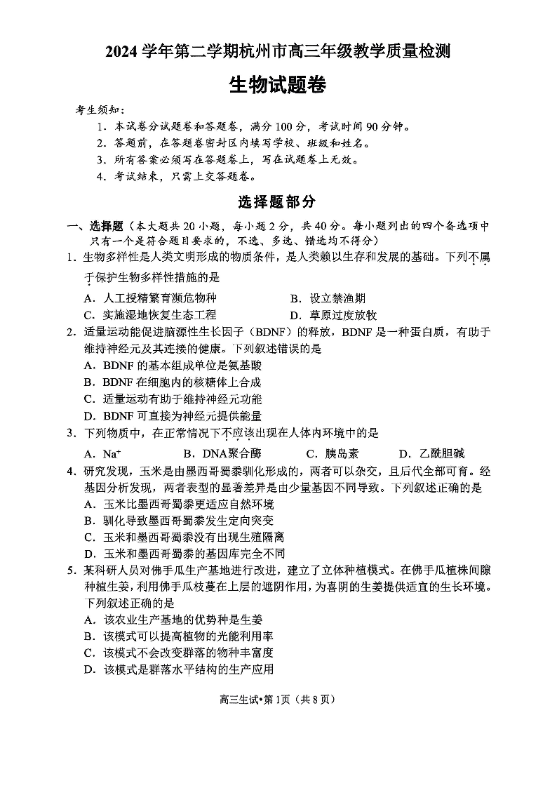 浙江省2024学年第二学期杭州市高三年级教学质量检测 生物.pdf