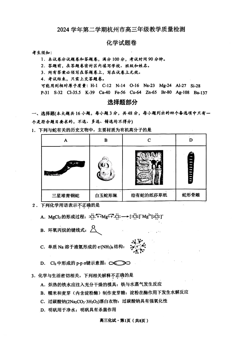 浙江省2024学年第二学期杭州市高三年级教学质量检测 化学.pdf