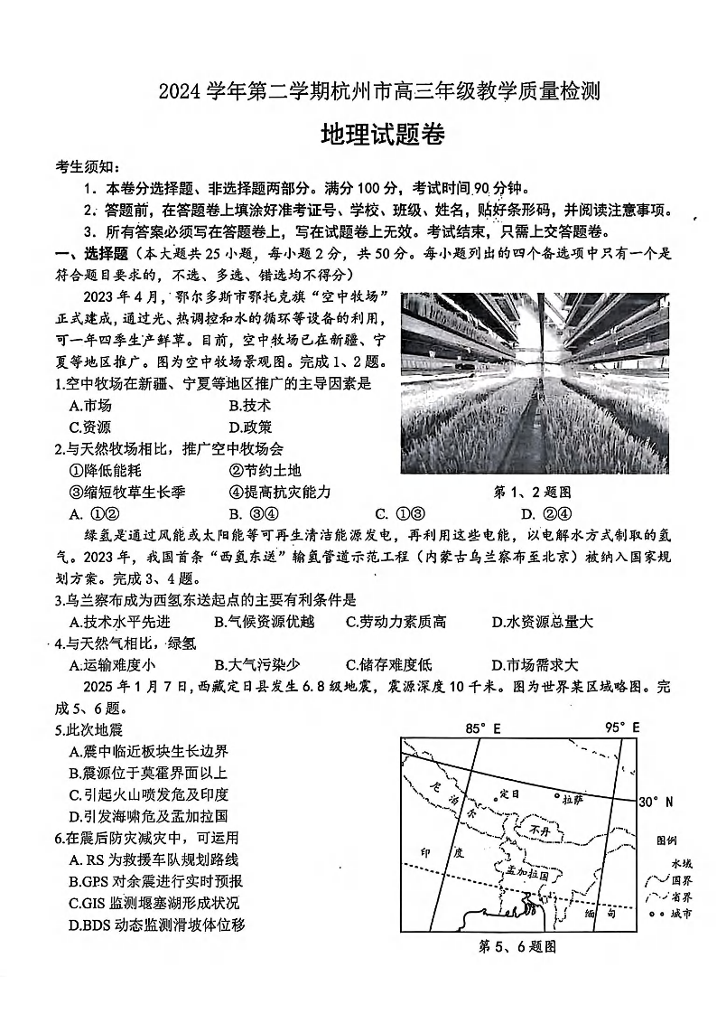 浙江省2024学年第二学期杭州市高三年级教学质量检测 地理.pdf