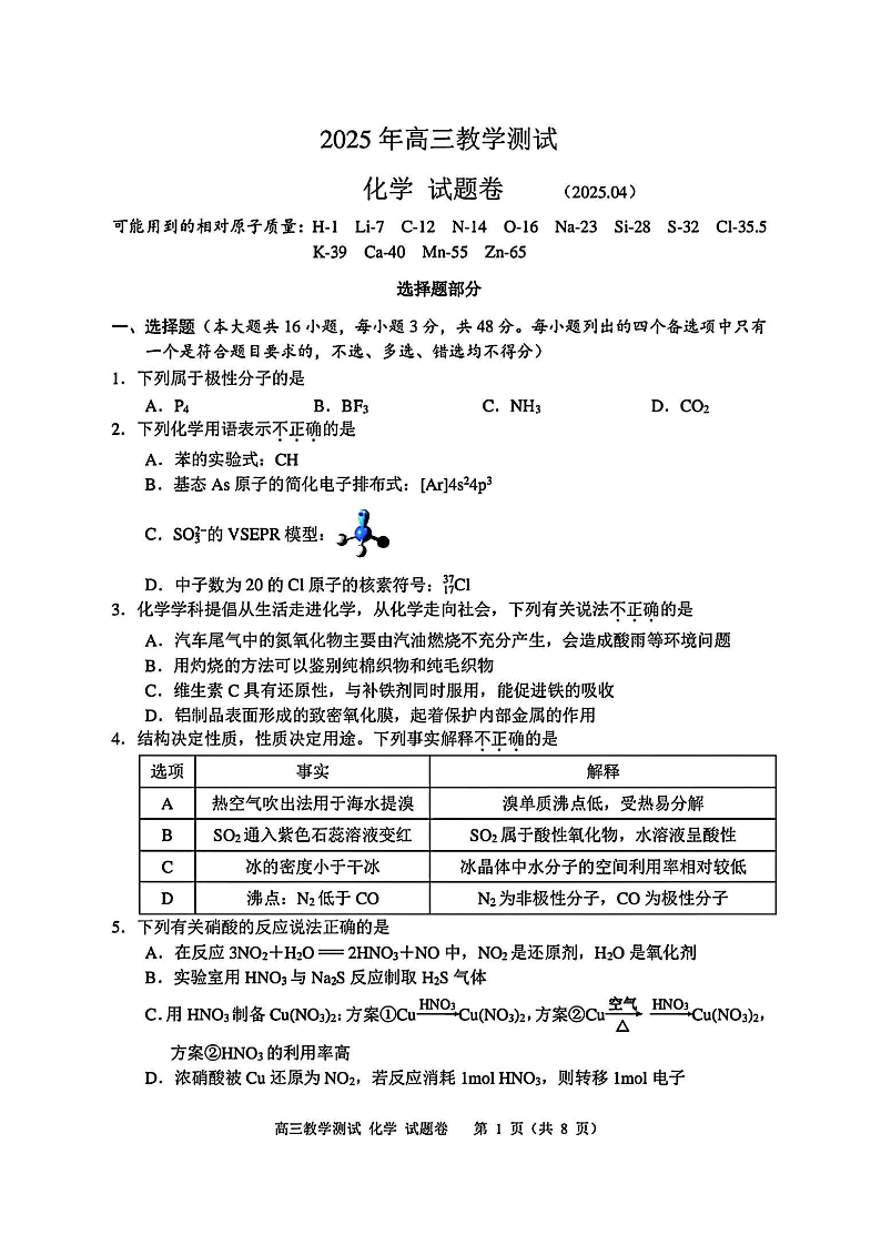 浙江省嘉兴市2025年4月高三教学测试 化学.pdf