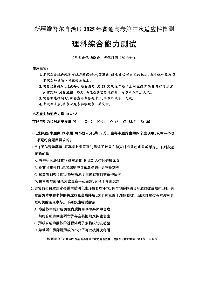 新疆维吾尔自治区2025年普通高考第三次适应性检测 理综.pdf