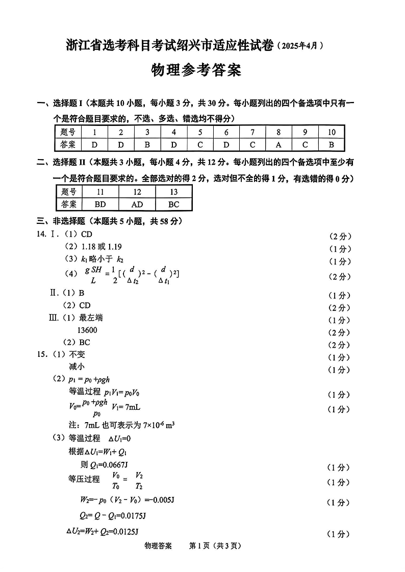 浙江省高考科目考试绍兴市适应性考试 物理答案.pdf