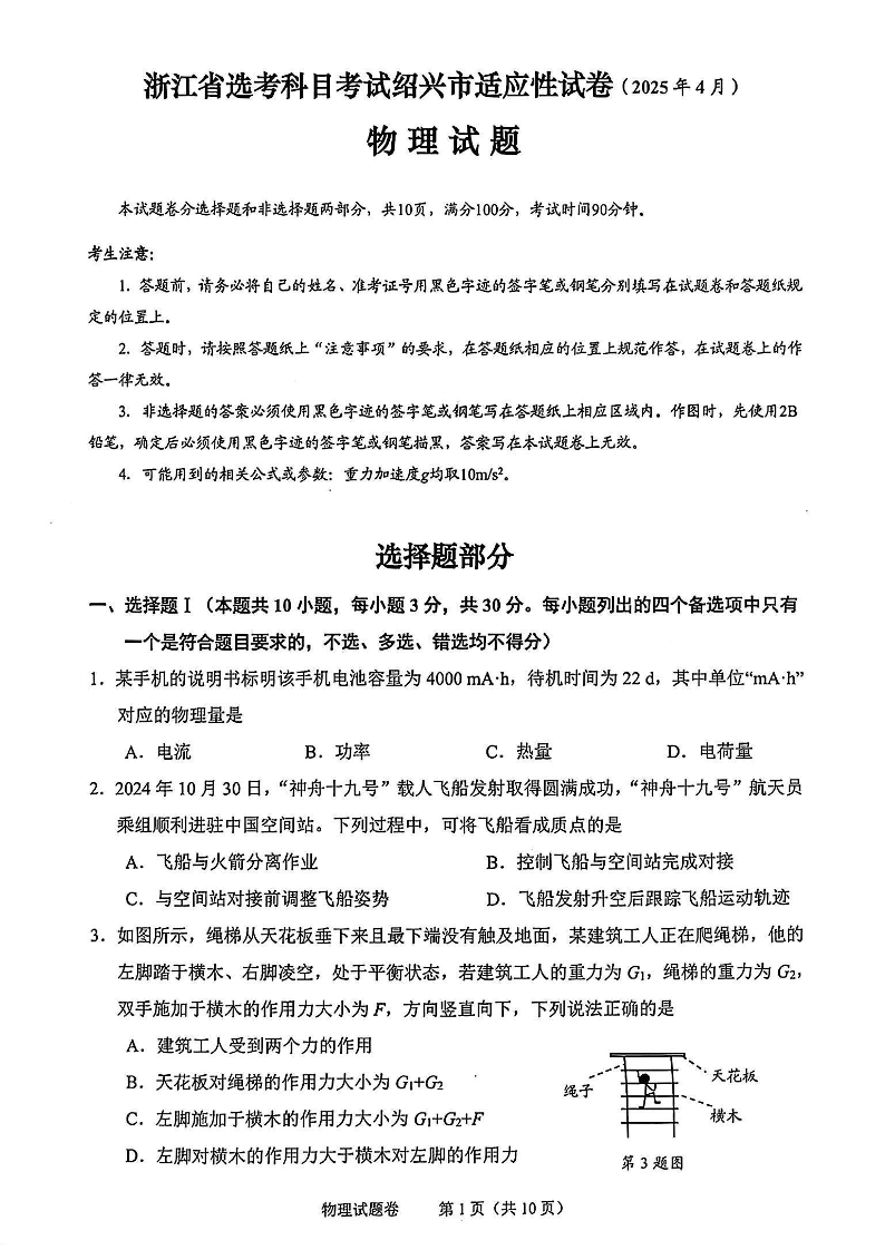 浙江省高考科目考试绍兴市适应性考试 物理.pdf