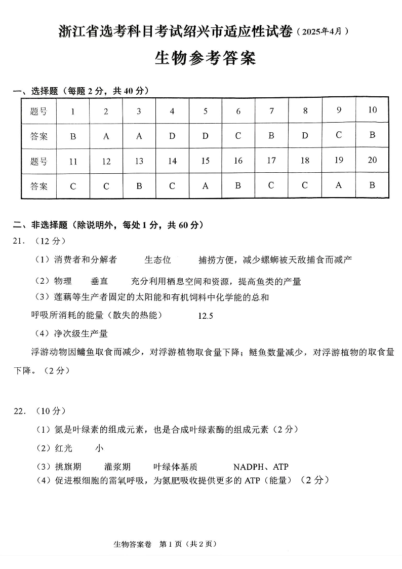 浙江省高考科目考试绍兴市适应性考试 生物答案.pdf