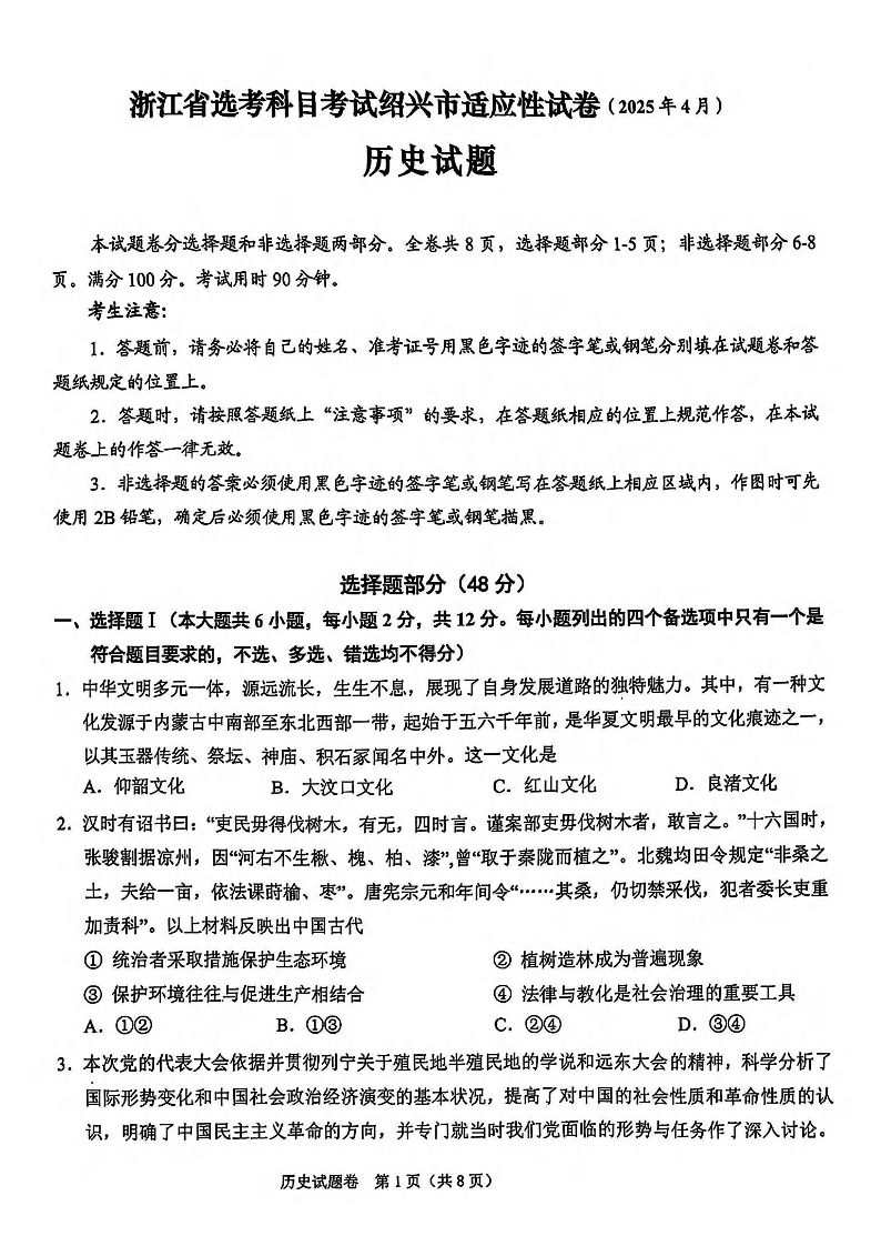 浙江省高考科目考试绍兴市适应性考试 历史.pdf