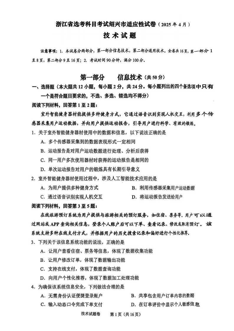 浙江省高考科目考试绍兴市适应性考试 技术.pdf