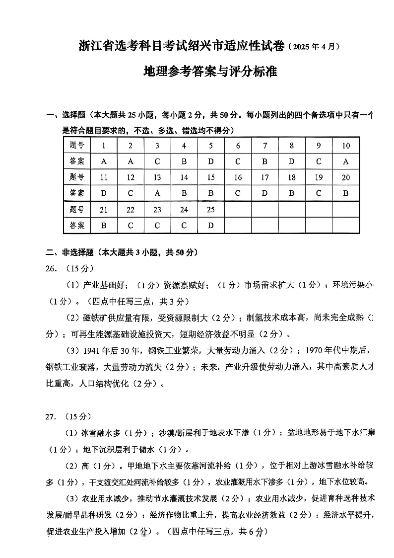 浙江省高考科目考试绍兴市适应性考试 地理答案.pdf