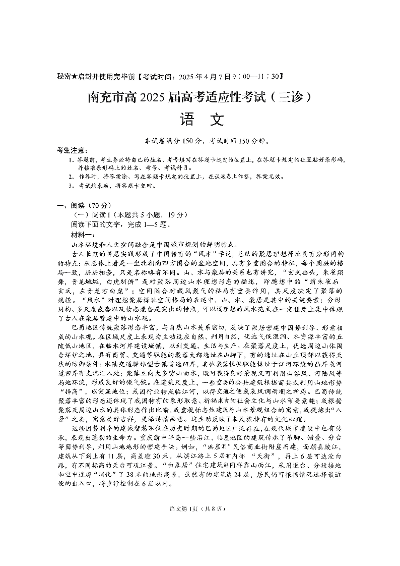 四川省南充市高2025届高考适应性考试(三诊)语文.pdf