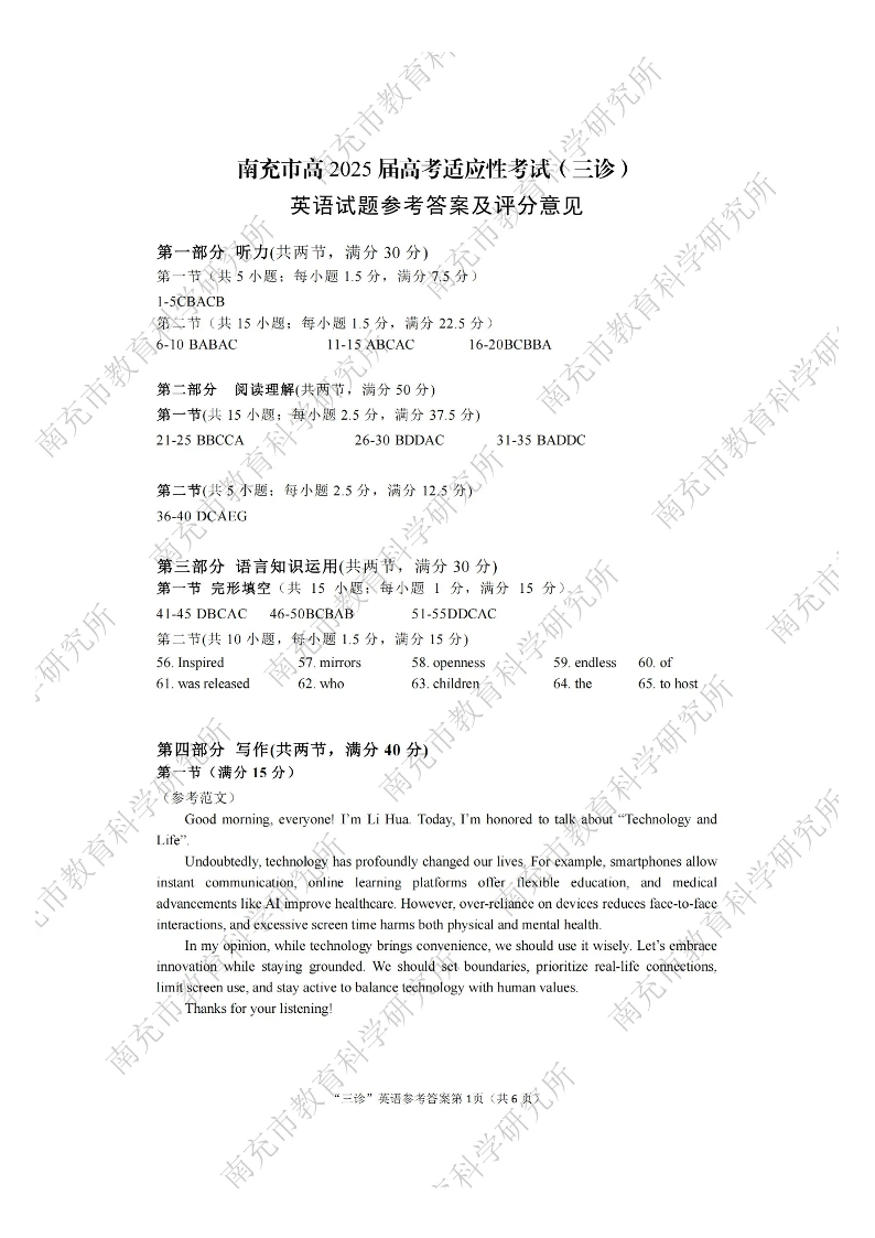 四川省南充市高2025届高考适应性考试(三诊)英语答案.pdf