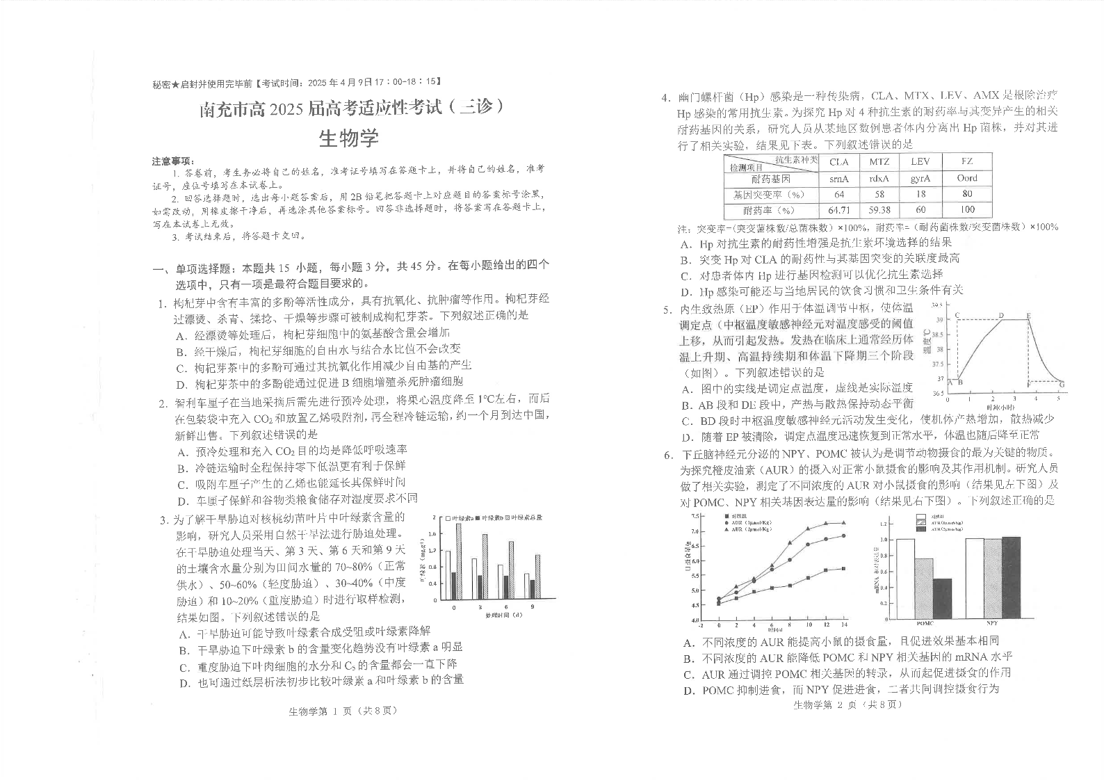 四川省南充市高2025届高考适应性考试(三诊)生物.pdf