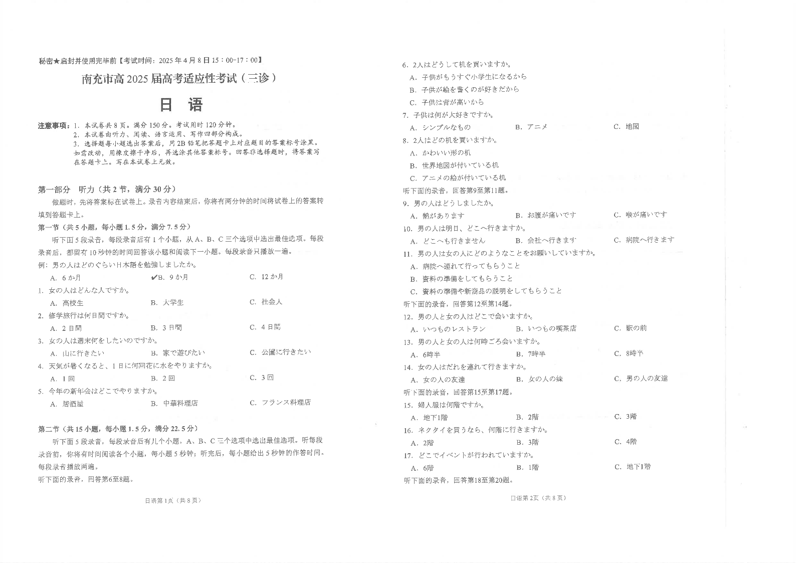 四川省南充市高2025届高考适应性考试(三诊)日语.pdf