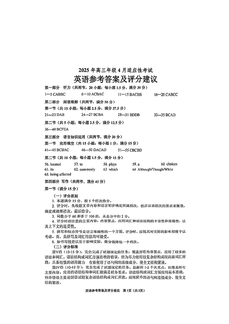 贵州省遵义市2025届高三年级模拟测试试卷(遵义三模)英语答案.pdf