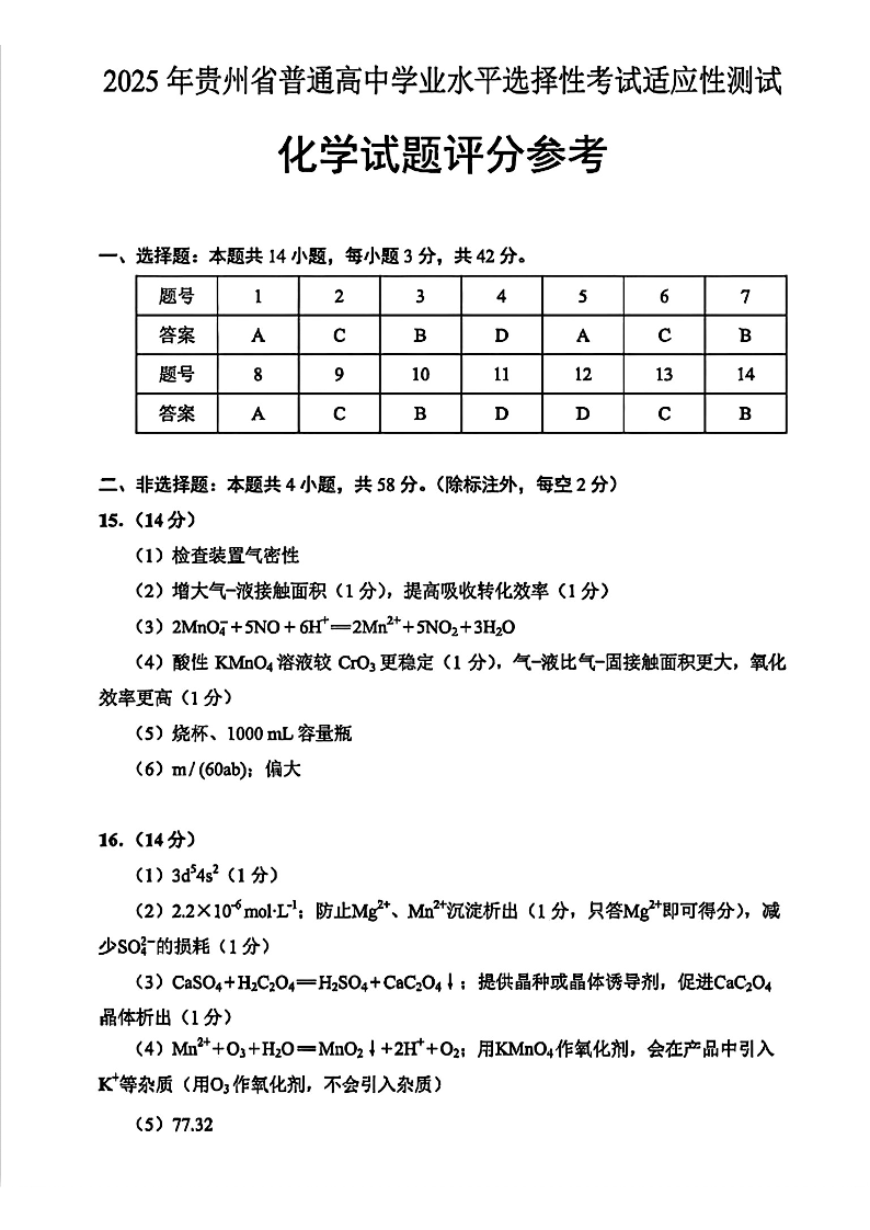 贵州省考试院2025年4月高三年级适应性考试 化学答案.pdf