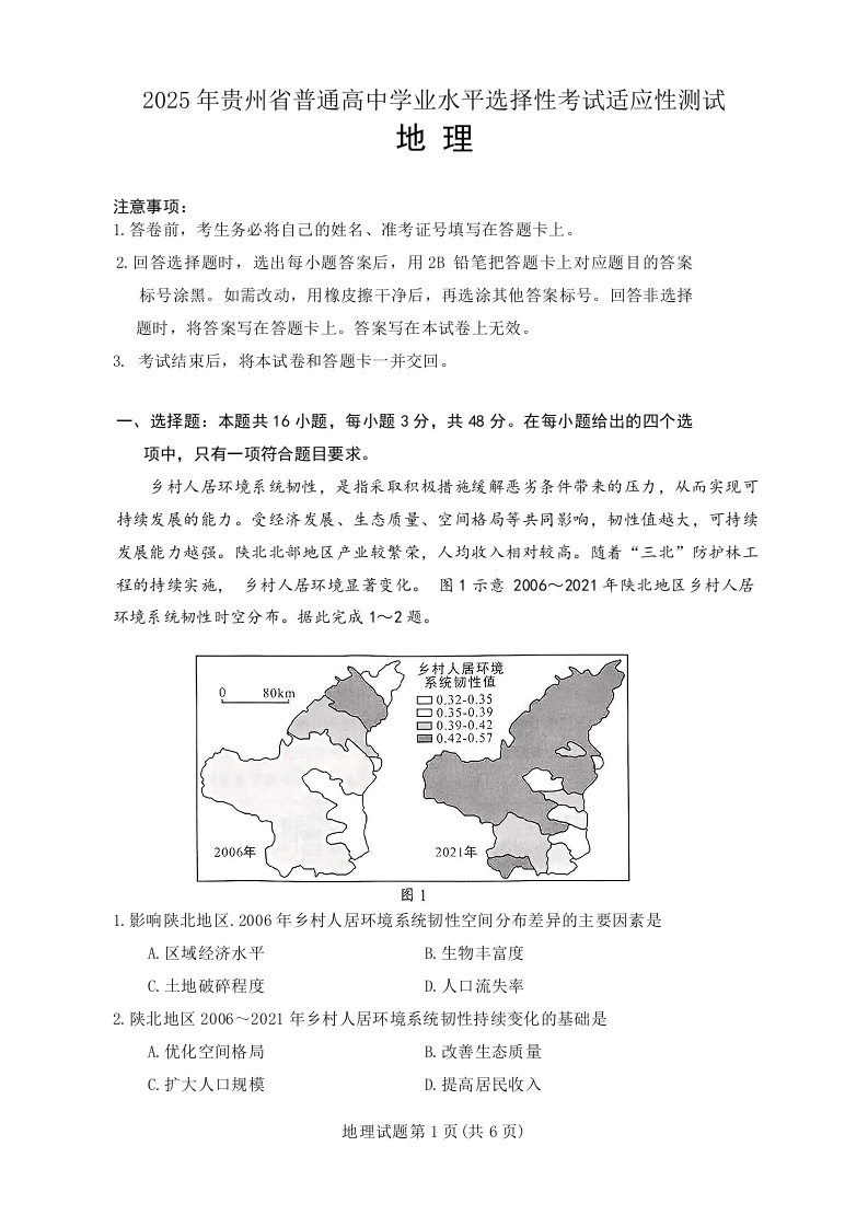 贵州省考试院2025年4月高三年级适应性考试 地理.docx