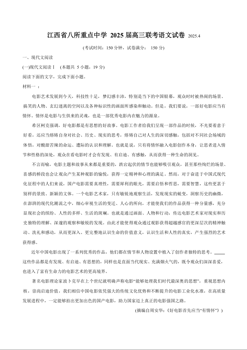 江西省八所重点2025届高三下学期4月联考(二模)语文试卷(含答案).docx
