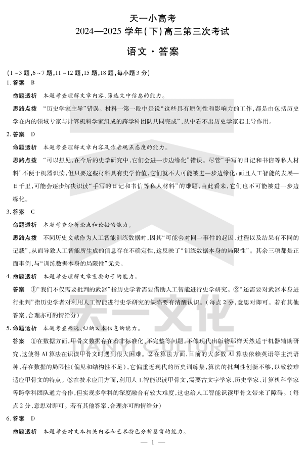 天一小高考2024-2025学年(下)高三第三次考试 语文答案.pdf