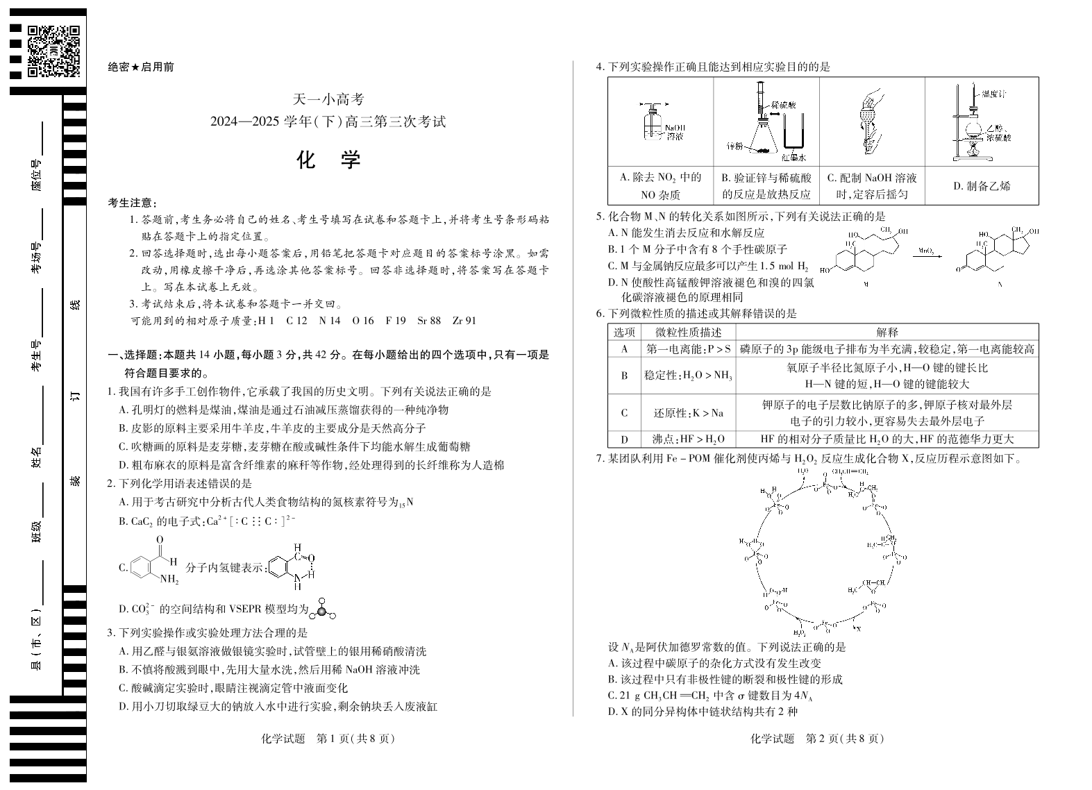 天一小高考2024-2025学年(下)高三第三次考试 化学.pdf