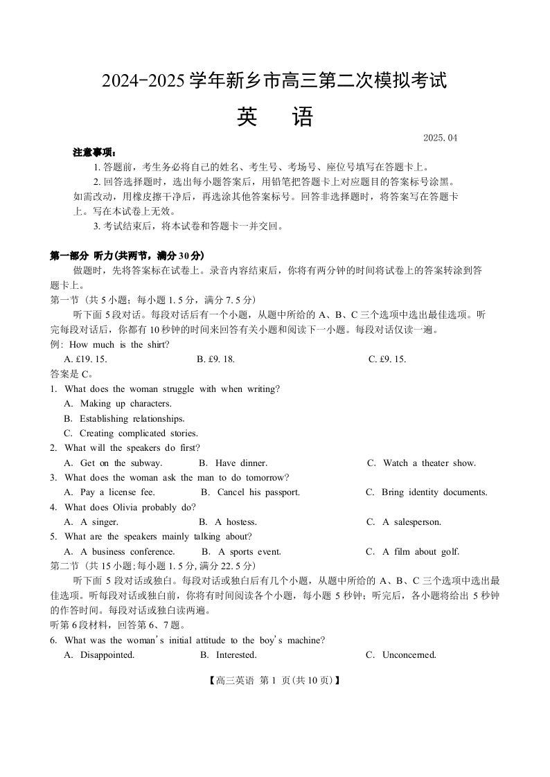 河南省新乡市部分学校2025年高三第二次模拟考试(新乡二模)英语.pdf