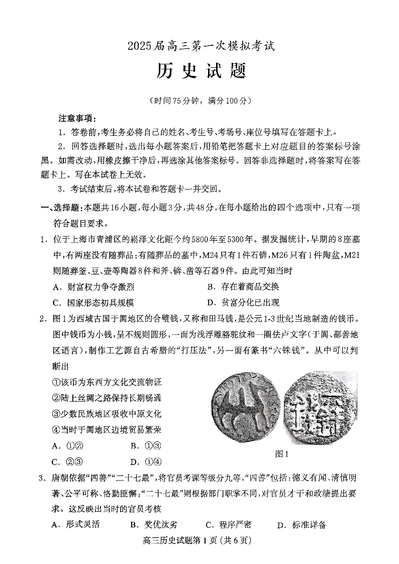 河北省保定市2025届高三下学期第一次模拟考试(保定一模)历史.pdf