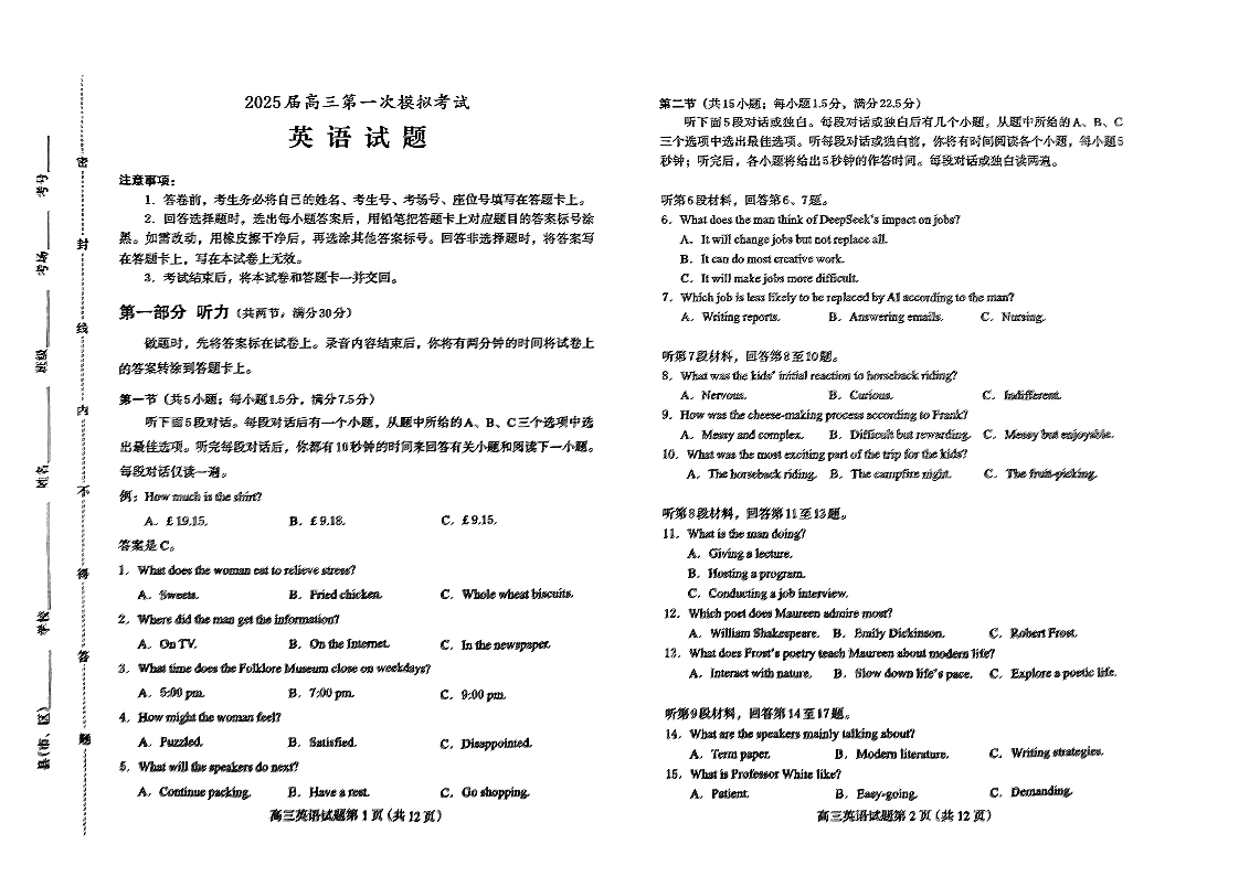 河北省保定市2025届高三下学期第一次模拟考试(保定一模)英语.pdf