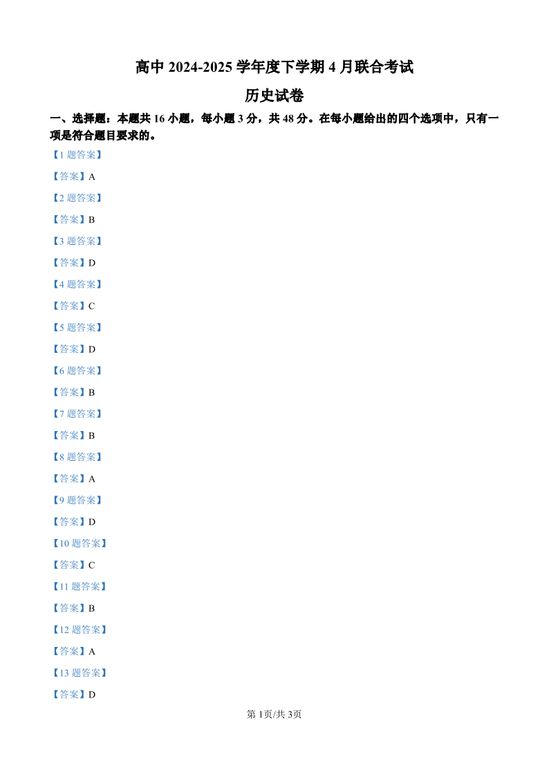 辽宁省普通高中2024-2025学年高一下学期4月联考 历史答案.pdf
