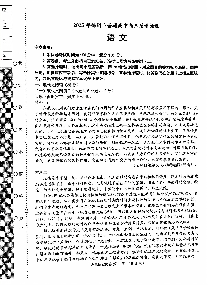 辽宁省锦州市2025届高三下学期4月质量检测(锦州一模)语文.pdf