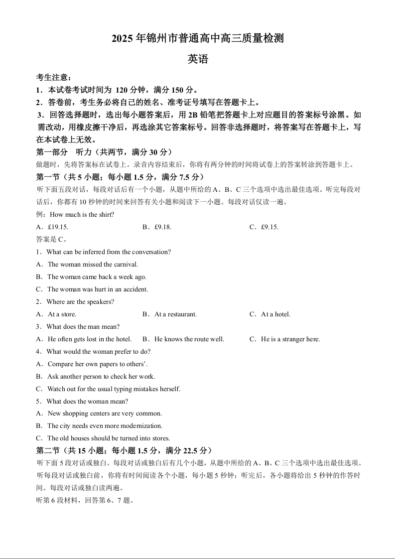 辽宁省锦州市2025届高三下学期4月质量检测(锦州一模)英语.docx