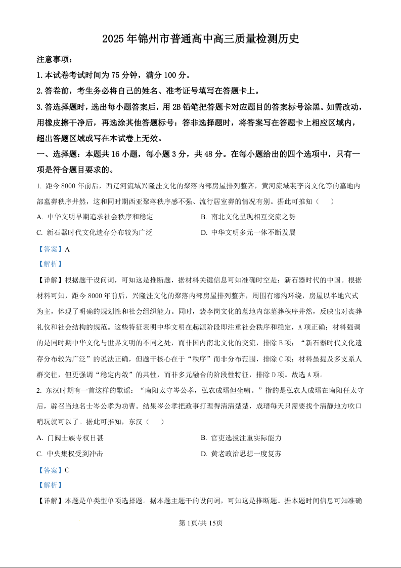 辽宁省锦州市2025届高三下学期4月质量检测(锦州一模)历史答案.docx