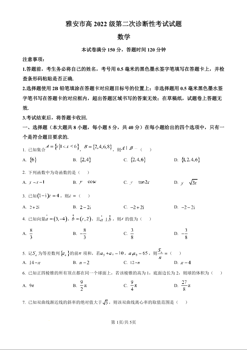 四川省雅安市2024-2025学年高三下学期第二次诊断性考试 数学.docx