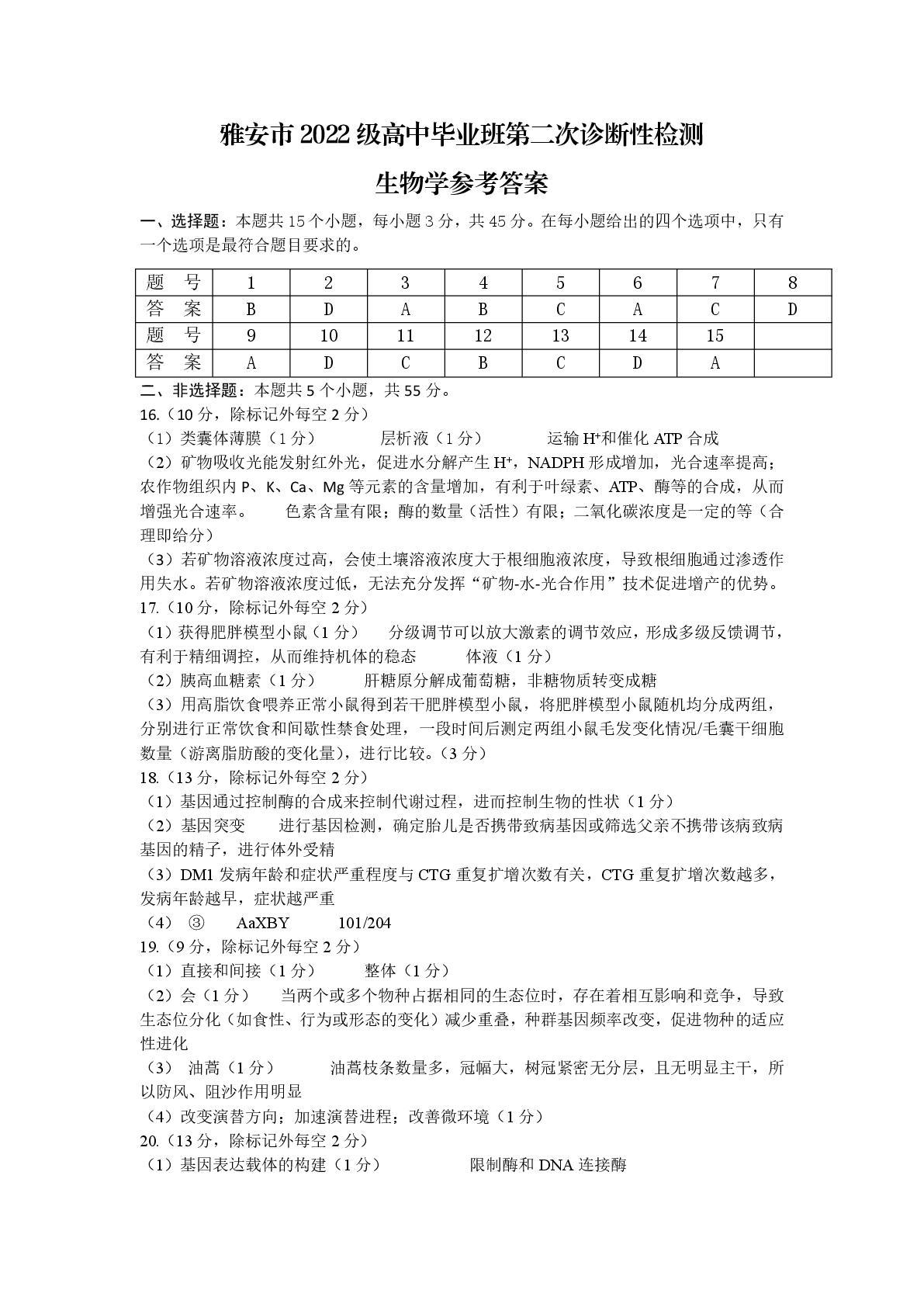 四川省雅安市2024-2025学年高三下学期第二次诊断性考试 生物参考答案.pdf