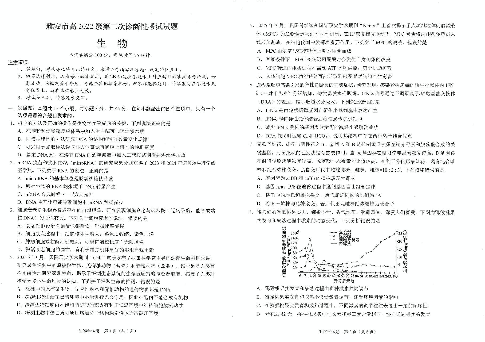 四川省雅安市2024-2025学年高三下学期第二次诊断性考试 生物.pdf