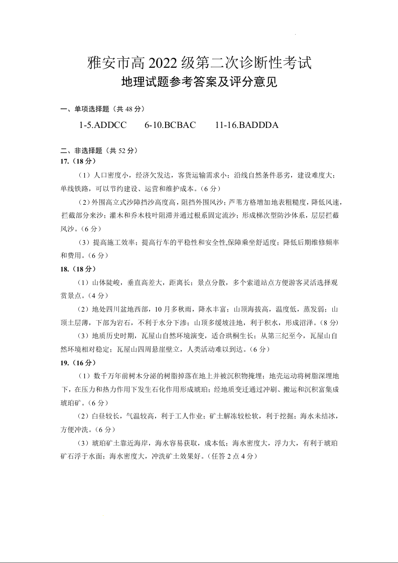 四川省雅安市2024-2025学年高三下学期第二次诊断性考试 地理参考答案.docx
