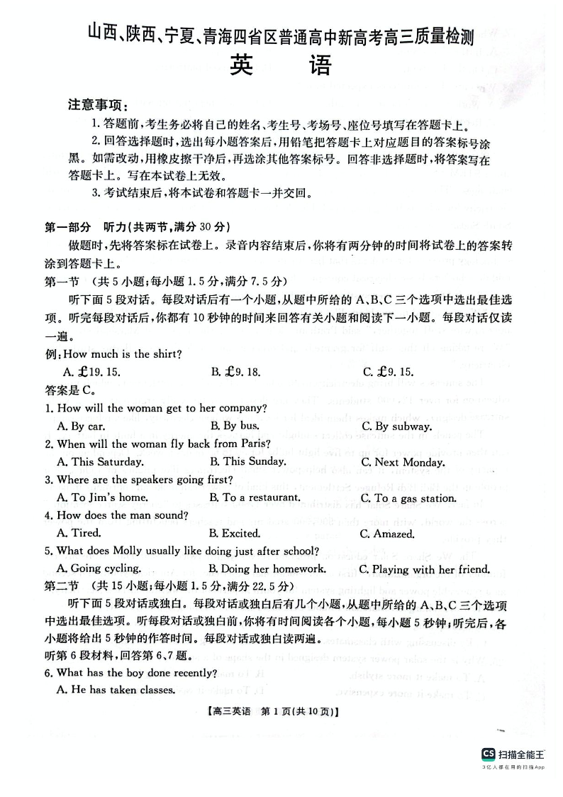 山西、陕西、宁夏、青海四省区普通高中新高考高三质量检测 英语(含答案).pdf