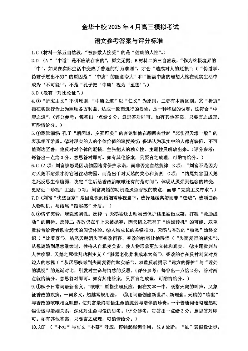 金华十校2025年4月高三模拟考试 语文答案.pdf