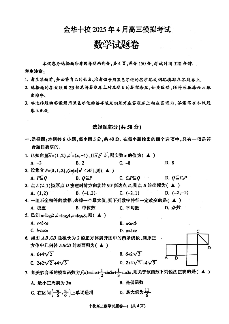 金华十校2025年4月高三模拟考试 数学.pdf