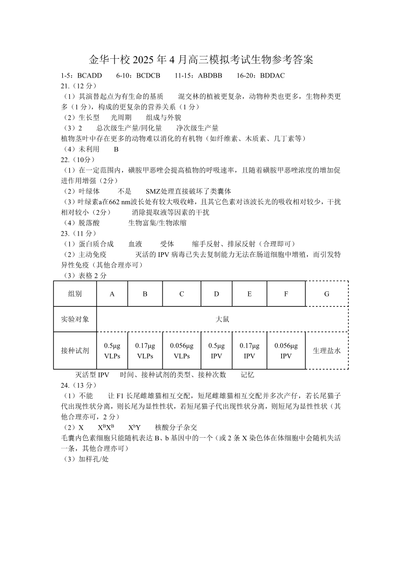 金华十校2025年4月高三模拟考试 生物答案.pdf