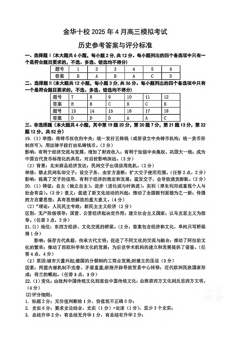金华十校2025年4月高三模拟考试 历史答案.pdf