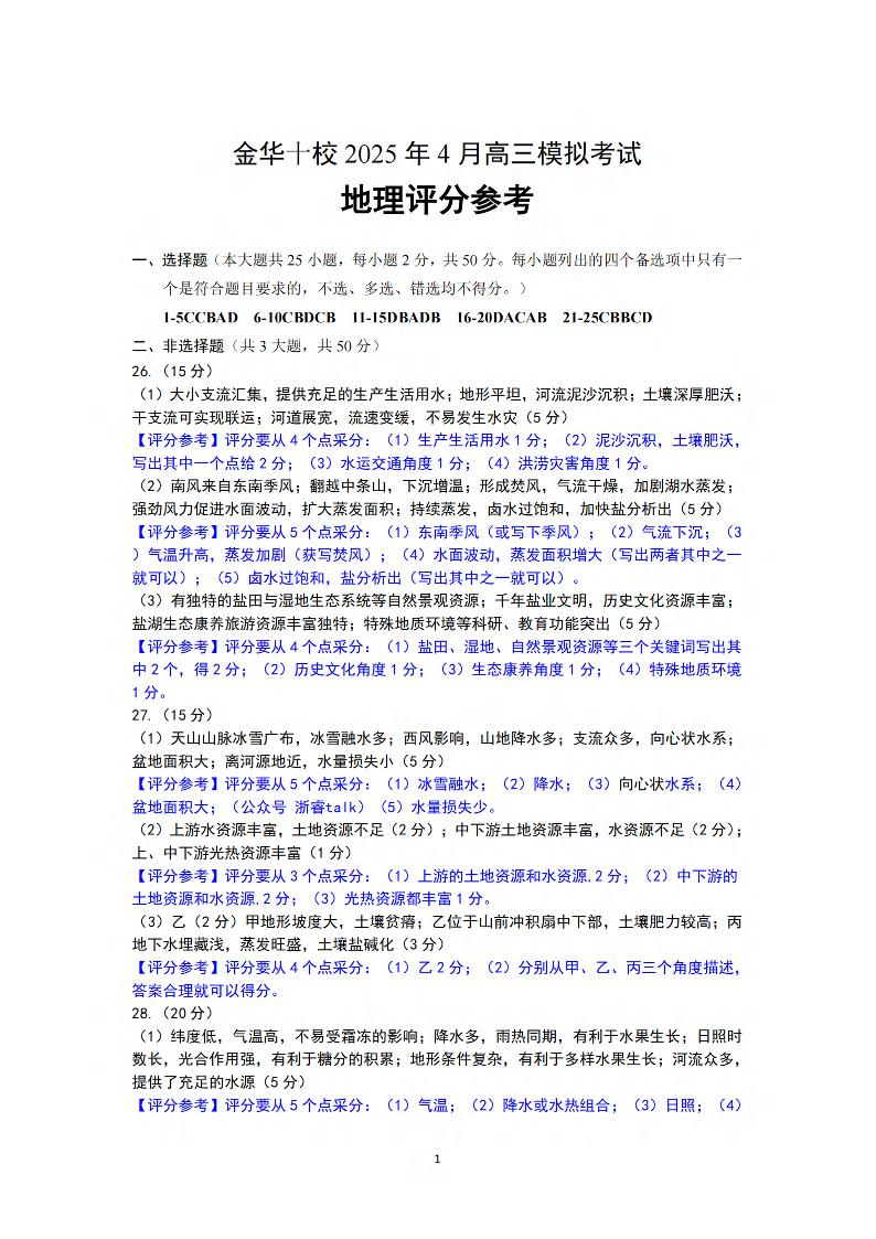 金华十校2025年4月高三模拟考试 地理答案.pdf