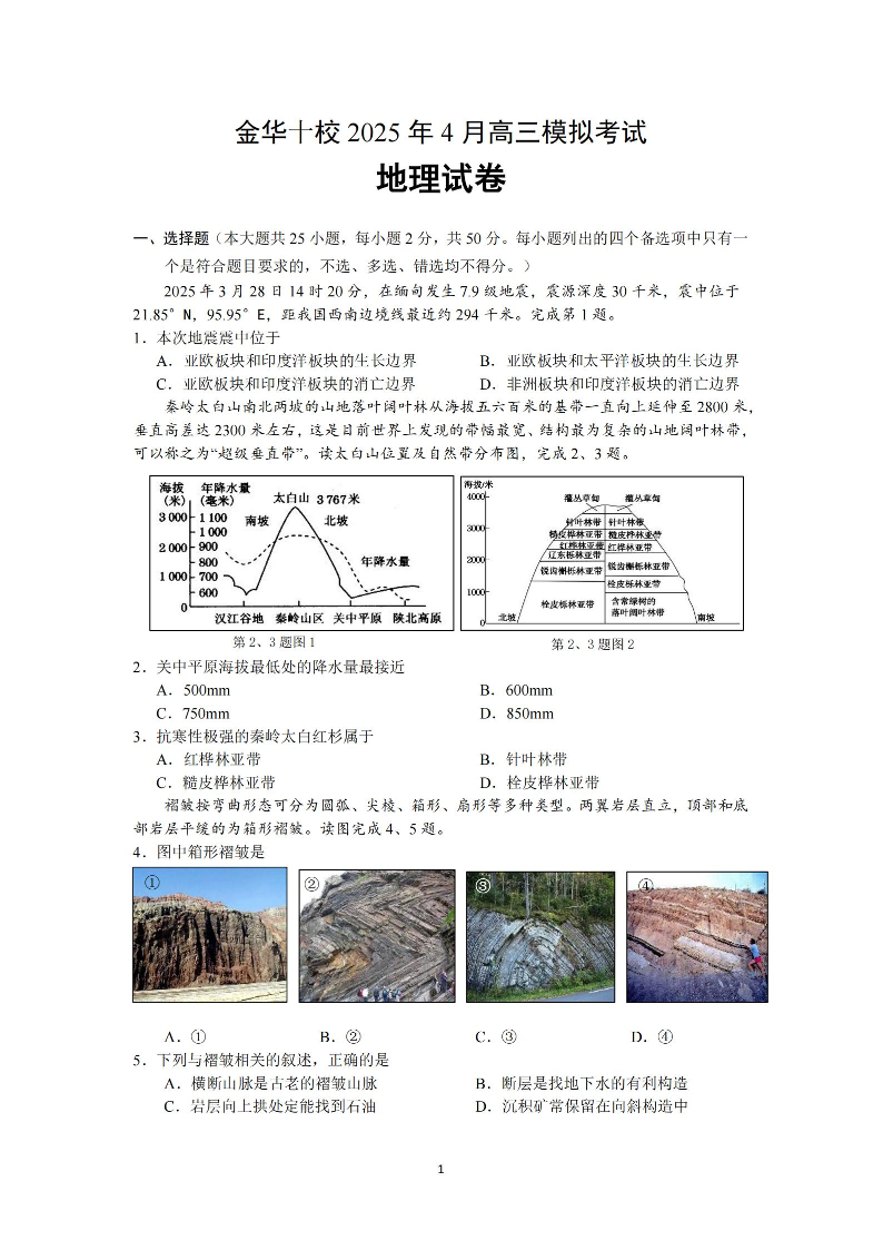 金华十校2025年4月高三模拟考试 地理.pdf