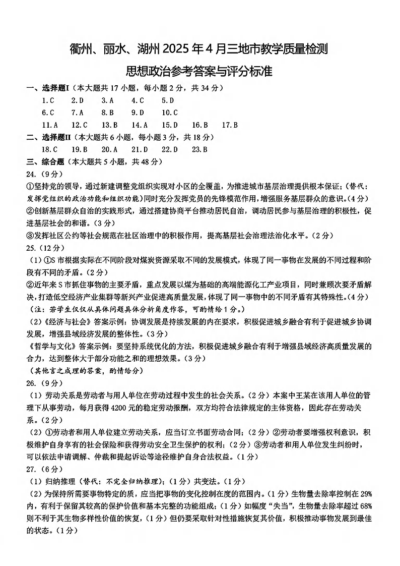 衢州、丽水、湖州2025年4月三地市高三教学质量检测 政治答案.pdf