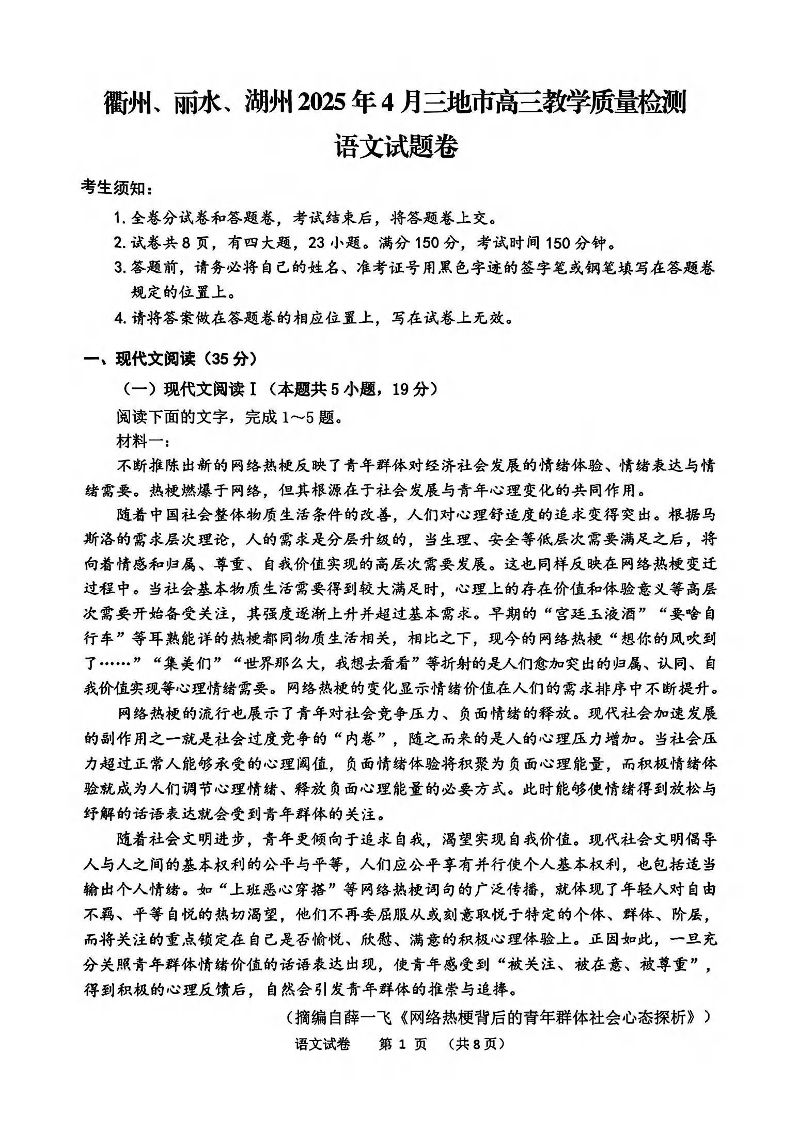衢州、丽水、湖州2025年4月三地市高三教学质量检测 语文.pdf