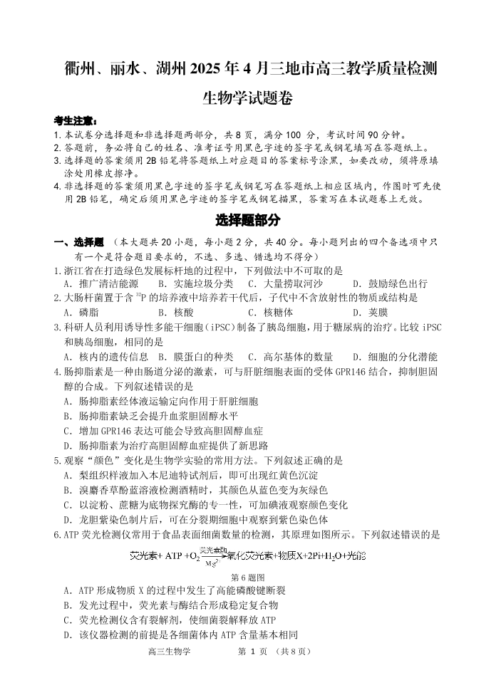 衢州、丽水、湖州2025年4月三地市高三教学质量检测 生物.pdf