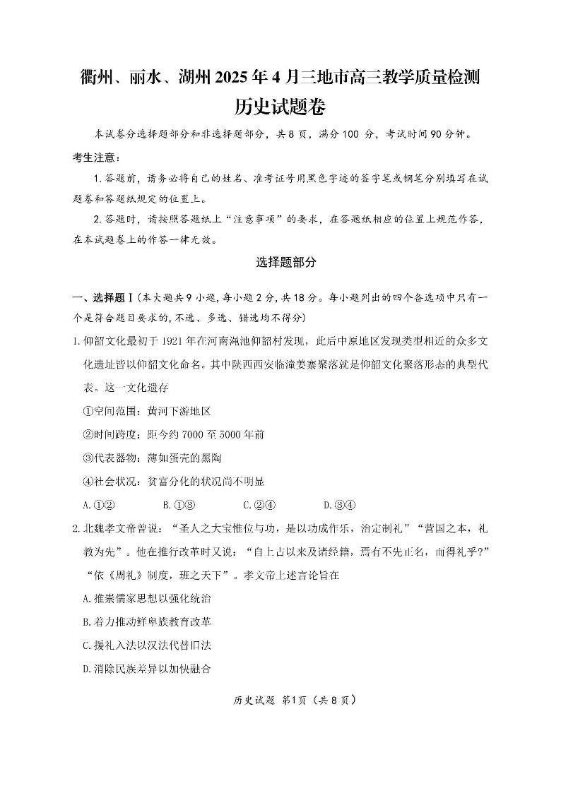 衢州、丽水、湖州2025年4月三地市高三教学质量检测 历史.pdf
