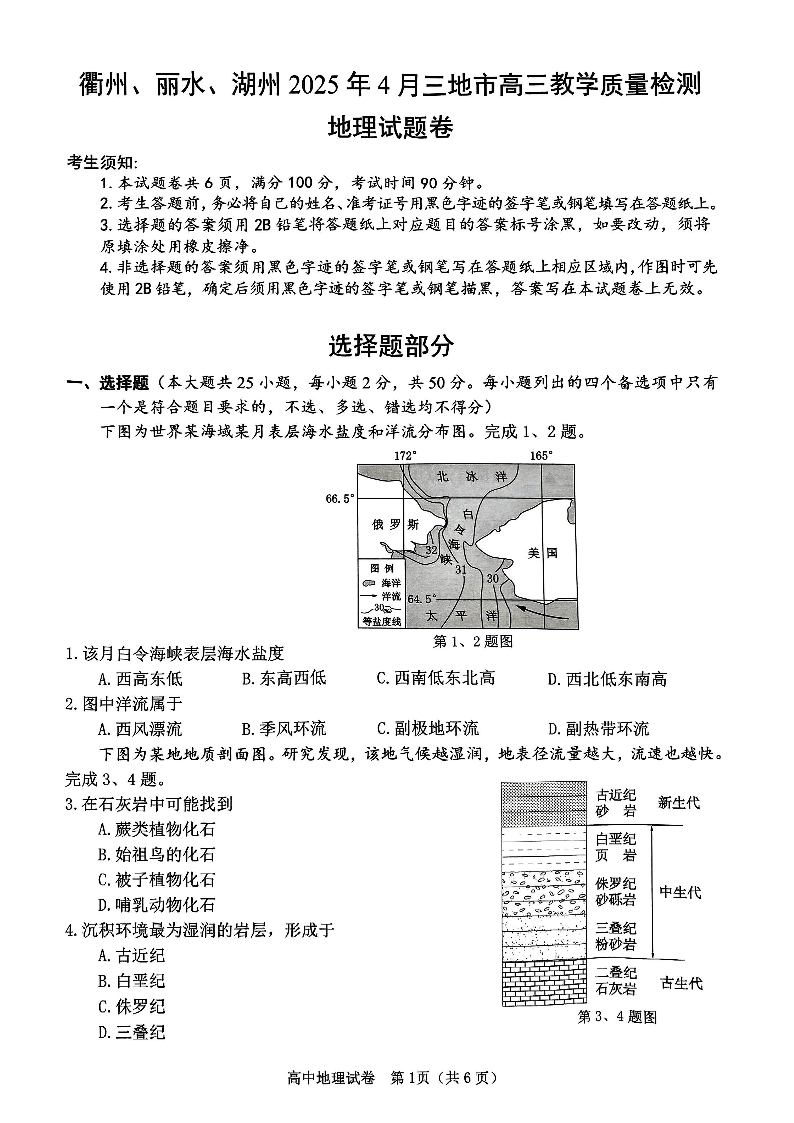 衢州、丽水、湖州2025年4月三地市高三教学质量检测 地理.pdf