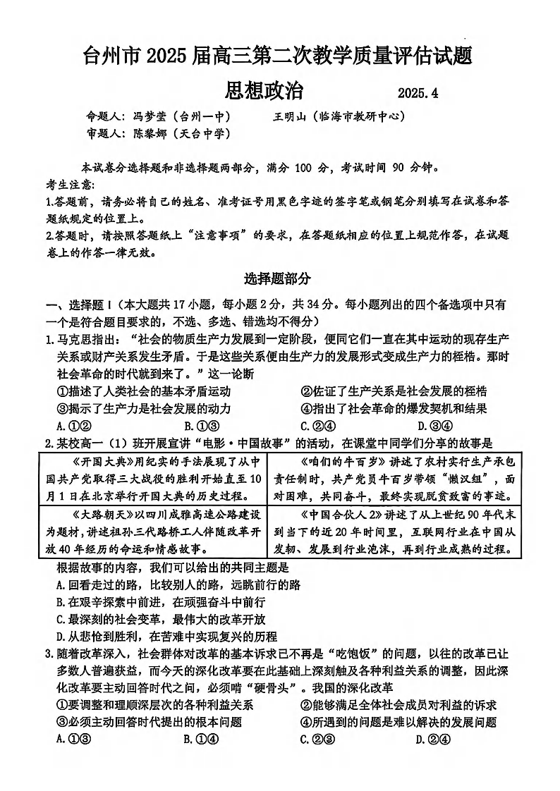 台州市2025届高三年级第二次教学质量评估试题 政治.pdf